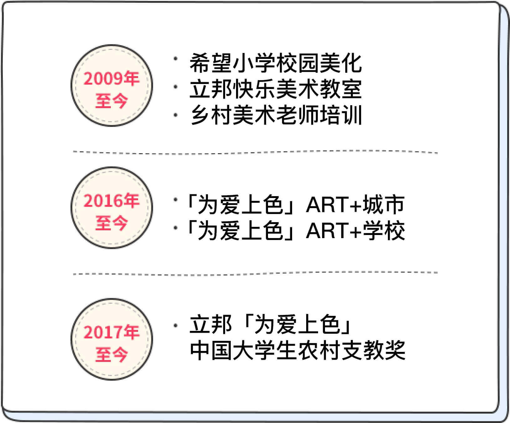 2017年,立邦中國加入共青團中央學校部指導下發起的“中國大學生知行促進計劃”,響應建設“美麗中國”號召,結合“一帶一路”和“精準扶貧”政策 ,開展“立邦「為愛上色」中國大學生農村支教獎”,鼓勵全國高校大學生深入鄉村,開展助學支教、傳統村落建筑及文化遺產調研等實踐活動。